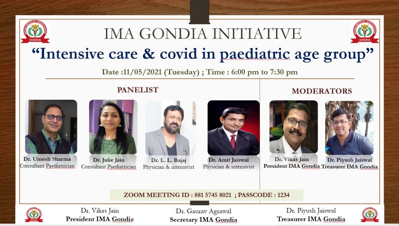 बुलंद गोंदिया। इंडियन मेडिकल एसोसिएशन गोंदिया द्वारा कोरोना संक्रमण काल में ऑनलाइन झूम सभा के माध्यम से निशुल्क जनजागृति की जा रही हैं। इसी अभियान के अंतर्गत आयोजित चौथी झूम सभा मंगलवार 11 मई को शाम 6:00 से 7:30 बजे के दौरान आयोजित की गई है। जिसमें गोंदिया के बाल रोग विशेषज्ञ डॉ उमेश शर्मा, बाल रोग विशेषज्ञ जूली जैन ,मेडिसिन विशेषज्ञ डॉक्टर लोकचंद बजाज, मेडिसिन विशेषज्ञ डॉक्टर अमित जायसवाल व आई एम ए के अध्यक्ष डॉक्टर विकास जैन व डॉक्टर पियूष जायसवाल मार्गदर्शन करेंगे ।गोंदिया आई एम ए द्वारा चलाए जा रहे इस अभियान का अधिक से अधिक नागरिकों द्वारा लाभ लेने का आव्हान इंडियन मेडिकल एसोसिएशन गोंदिया द्वारा किया गया है।